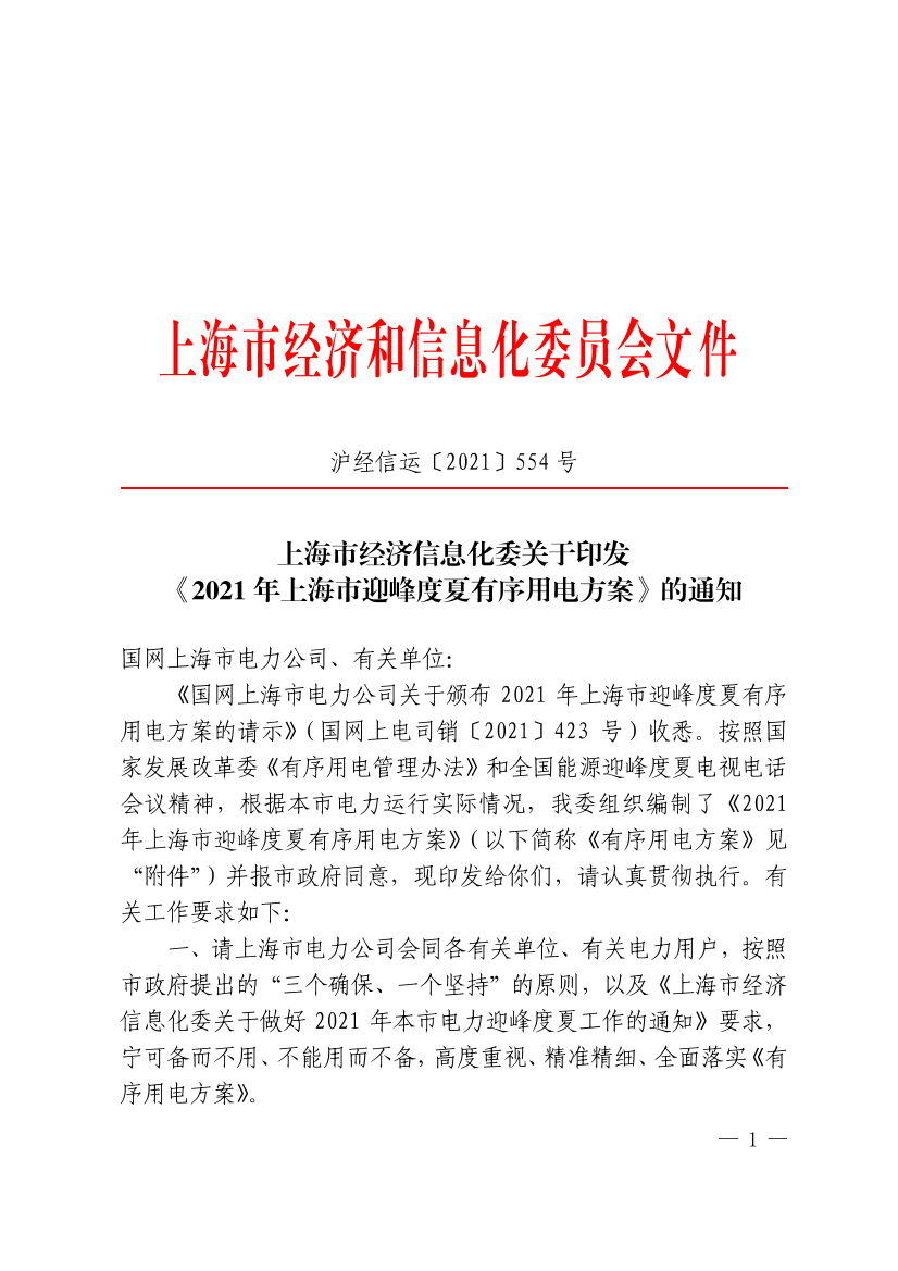 《国网上海市电力公司关于颁布2021年上海市迎峰度夏有序用电方案的请示》(国网上电司销〔2021〕423号)收悉。按照国家发展改革委《有序用电管理办法》和全国能源迎峰度夏电视电话会议精神,根据本市电力运行实际情况,我委组织编制了《2021年上海市迎峰度夏有序用电方案》(以下简称《有序用电方案》见“附件”)并报市政府同意,现印发给你们,请认真贯彻执行。有关工作要求如下: