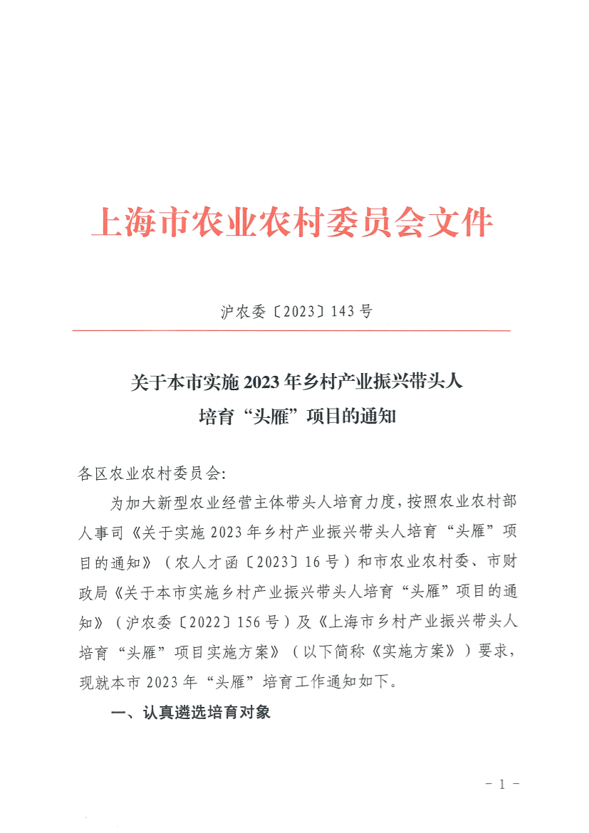 为加大新型农业经营主体带头人培育力度,按照农业农村部人事司《关于实施2023年乡村产业振兴带头人培育“头雁”项目的通知》(农人才函〔2023〕16号)和市农业农村委、市财政局《关于本市实施乡村产业振兴带头人培育“头雁”项目的通知》(沪农委〔2022〕156号)及《上海市乡村产业振兴带头人培育“头雁”项目实施方案》(以下简称《实施方案》)要求,现就本市2023年“头雁”培育工作通知如下。