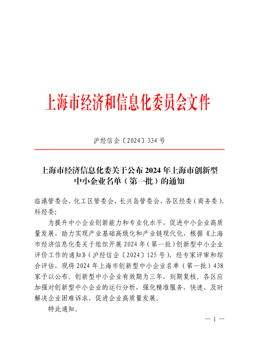 为提升中小企业创新能力和专业化水平,促进中小企业高质量发展,助力实现产业基础高级化和产业链现代化,根据《上海市经济信息化委关于组织开展2024年(第一批)创新型中小企业评价工作的通知》(沪经信企〔2024〕125号),经专家评审和综合评估,现将2024年上海市创新型中小企业名单(第一批)438家予以公布。创新型中小企业有效期为三年,到期复核。各区应加强对创新型中小企业的运行分析,强化精准服务,快速、及时解决企业困难诉求,促进企业高质量发展。