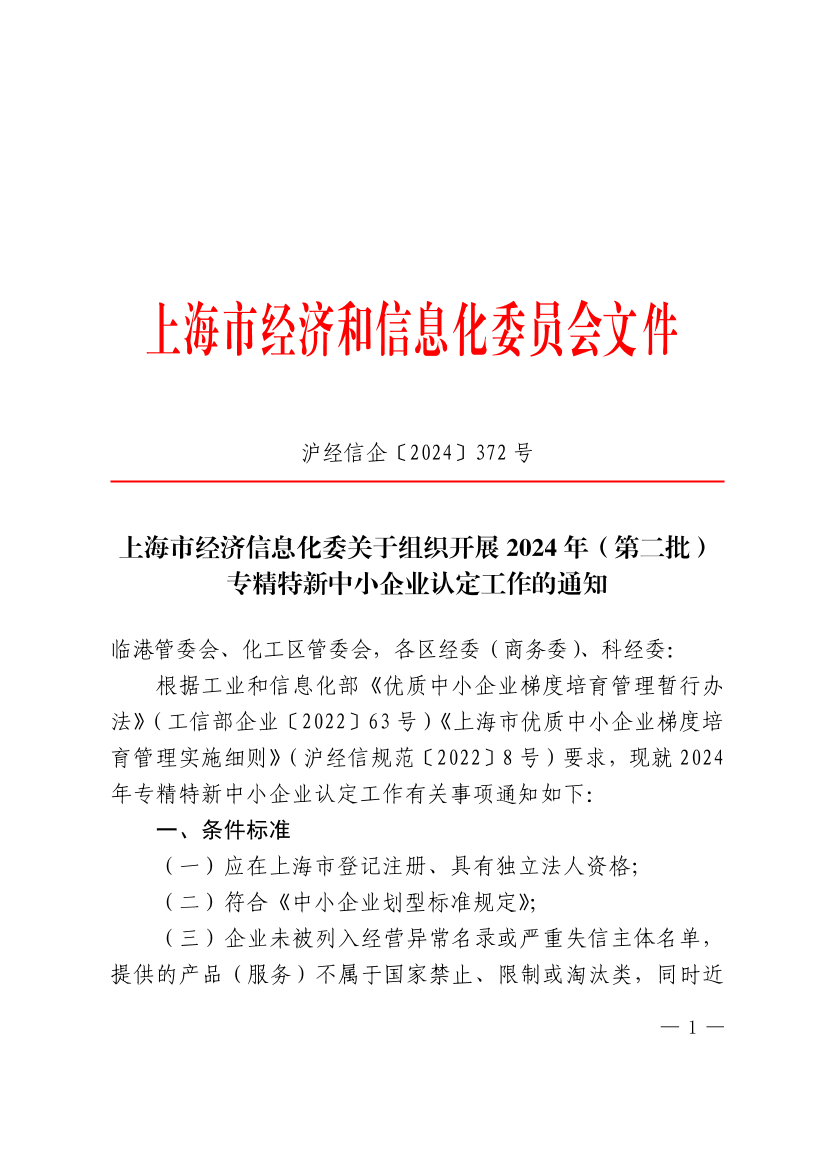 根据工业和信息化部《优质中小企业梯度培育管理暂行办法》(工信部企业〔2022〕63号)《上海市优质中小企业梯度培育管理实施细则》(沪经信规范〔2022〕8号)要求,现就2024年专精特新中小企业认定工作有关事项通知如下: