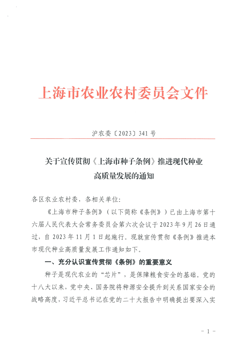 《上海市种子条例》(以下简称《条例》)已由上海市第十六届人民代表大会常务委员会第六次会议于2023年9月26日通过,自2023年11月1日起施行。现就宣传贯彻《条例》推进本市现代种业高质量发展工作通知如下。