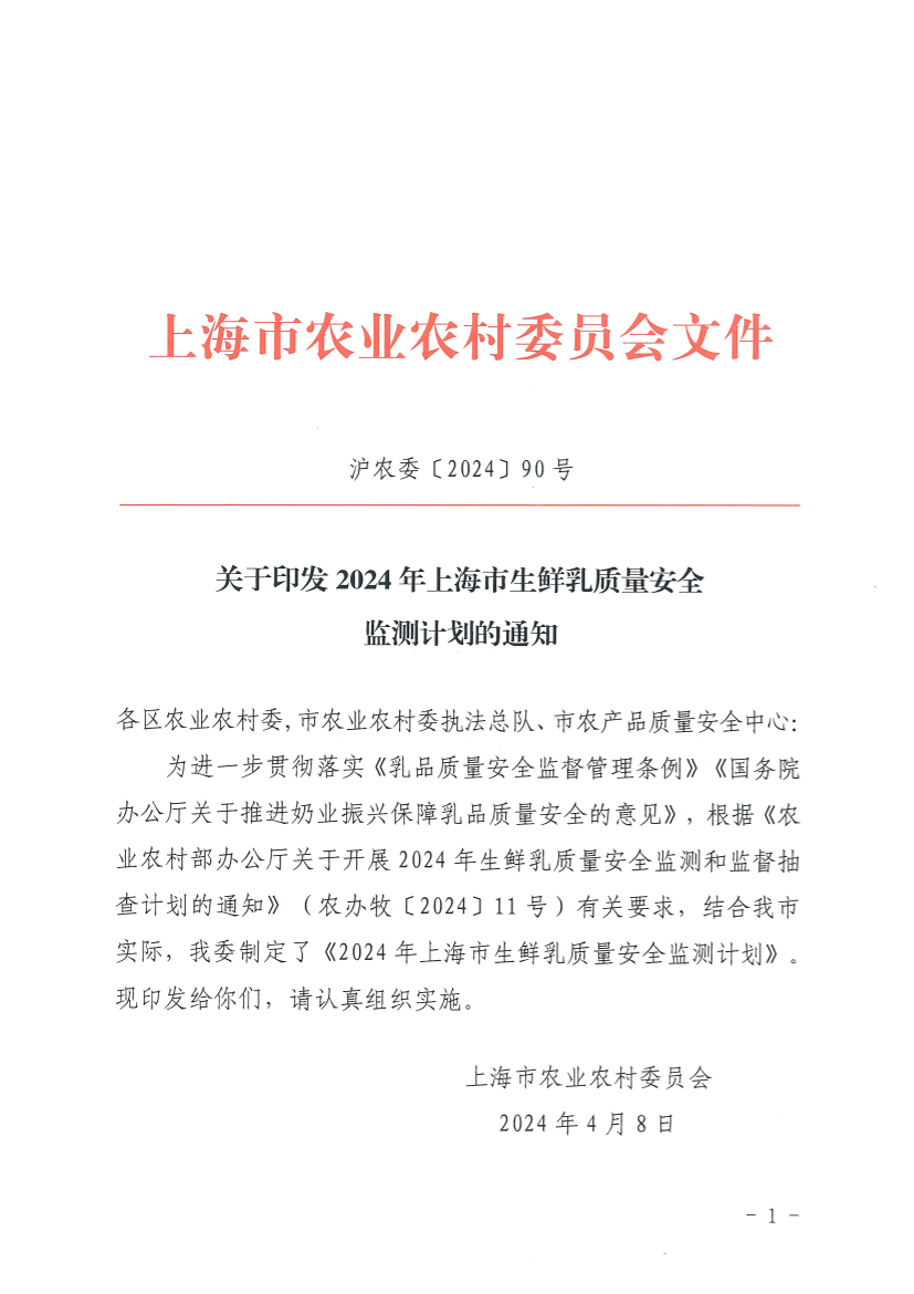 为进一步贯彻落实《乳品质量安全监督管理条例》《国务院办公厅关于推进奶业振兴保障乳品质量安全的意见》,根据《农业农村部办公厅关于开展2024年生鲜乳质量安全监测和监督抽查计划的通知》(农办牧〔2024〕11号)有关要求,结合我市实际,我委制定了《2024年上海市生鲜乳质量安全监测计划》。现印发给你们,请认真组织实施。