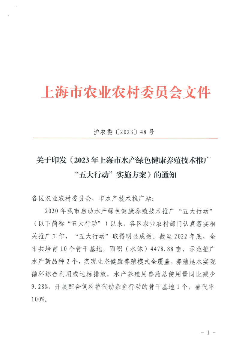 近日,农业农村部渔业渔政管理局印发《关于做好2023年水产绿色健康养殖技术推广“五大行动”工作的通知》(农办渔〔2023〕3号),对2023年“五大行动”相关工作提出要求。为做好本年度“五大行动”相关推广工作,经研究,我委制定了《2023年上海市水产绿色健康养殖技术推广“五大行动”实施方案》,现印发你们,请遵照执行。