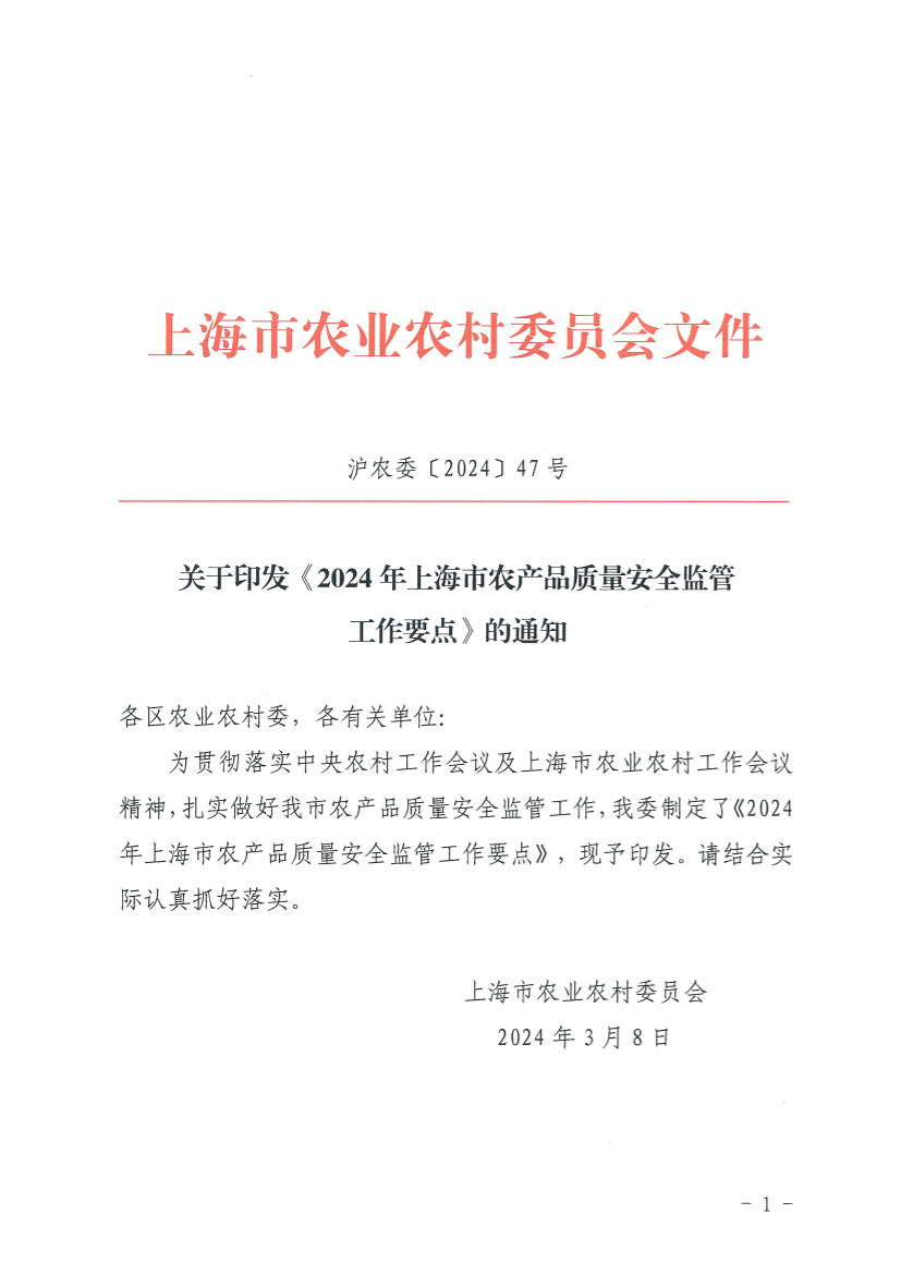 为贯彻落实中央农村工作会议及上海市农业农村工作会议精神,扎实做好我市农产品质量安全监管工作,我委制定了《2024年上海市农产品质量安全监管工作要点》,现予印发。请结合实际认真抓好落实。