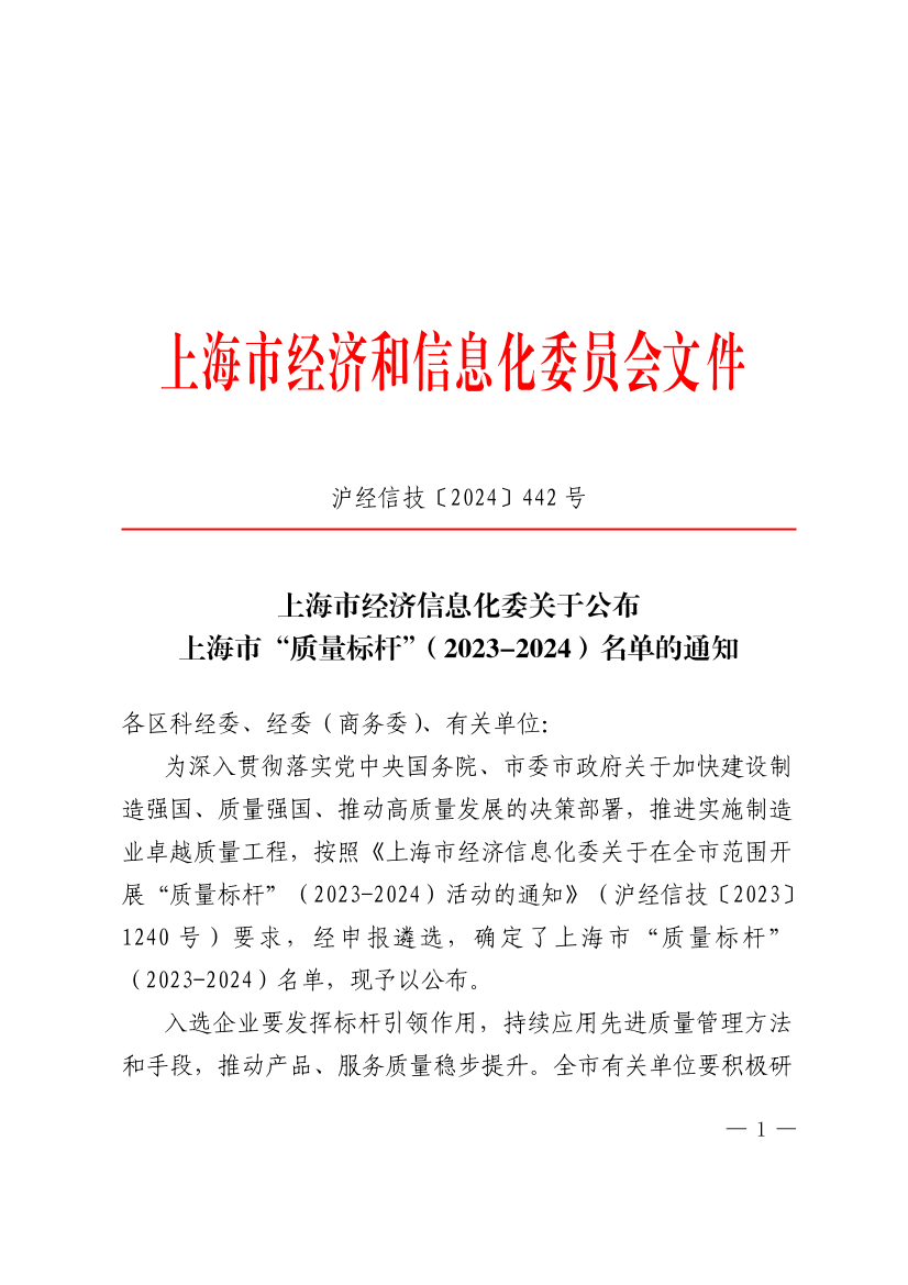 为深入贯彻落实党中央国务院、市委市政府关于加快建设制造强国、质量强国、推动高质量发展的决策部署,推进实施制造业卓越质量工程,按照《上海市经济信息化委关于在全市范围开展“质量标杆”(2023-2024)活动的通知》(沪经信技〔2023〕1240号)要求,经申报遴选,确定了上海市“质量标杆”(2023-2024)名单,现予以公布。
