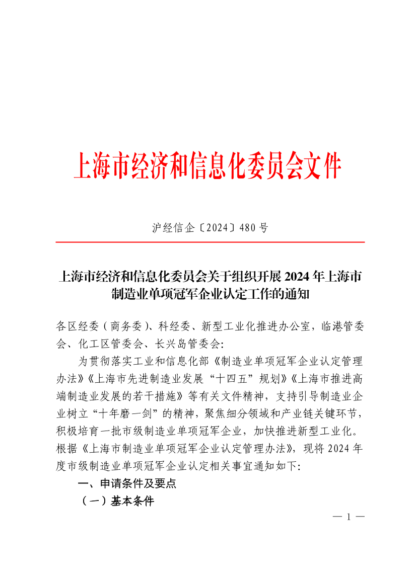为贯彻落实工业和信息化部《制造业单项冠军企业认定管理办法》《上海市先进制造业发展“十四五”规划》《上海市推进高端制造业发展的若干措施》等有关文件精神,支持引导制造业企业树立“十年磨一剑”的精神,聚焦细分领域和产业链关键环节,积极培育一批市级制造业单项冠军企业,加快推进新型工业化。根据《上海市制造业单项冠军企业认定管理办法》,现将2024年度市级制造业单项冠军企业认定相关事宜通知如下: