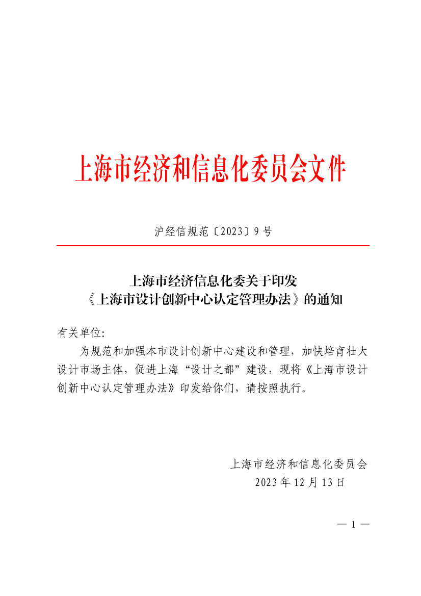 为规范和加强本市设计创新中心建设和管理,加快培育壮大设计市场主体,促进上海“设计之都”建设,现将《上海市设计创新中心认定管理办法》印发给你们,请按照执行。