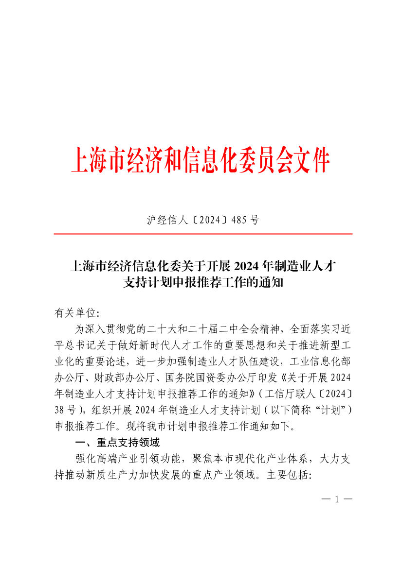 为深入贯彻党的二十大和二十届二中全会精神,全面落实习近平总书记关于做好新时代人才工作的重要思想和关于推进新型工业化的重要论述,进一步加强制造业人才队伍建设,工业信息化部办公厅、财政部办公厅、国务院国资委办公厅印发《关于开展2024年制造业人才支持计划申报推荐工作的通知》(工信厅联人〔2024〕38号),组织开展2024年制造业人才支持计划(以下简称“计划”)申报推荐工作。现将我市计划申报推荐工作通知如下。