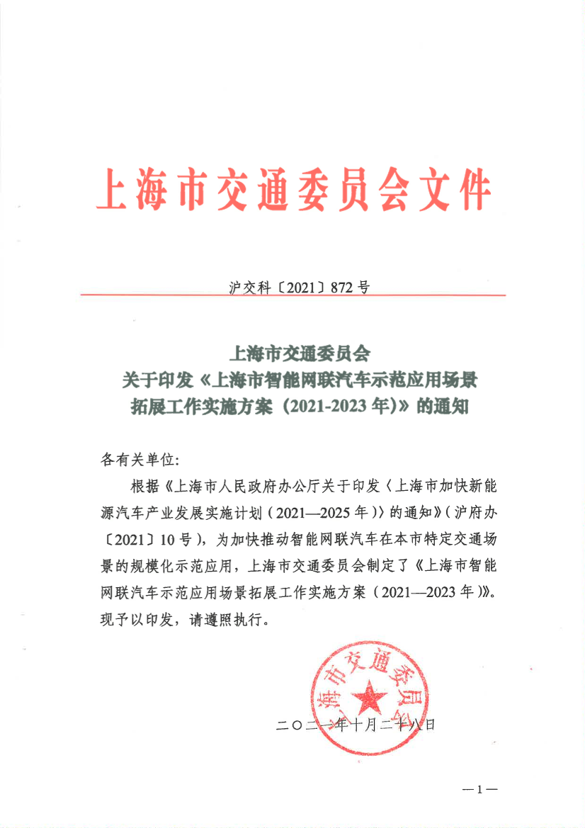 根据《上海市人民政府办公厅关于印发〈上海市加快新能源汽车产业发展实施计划(2021—2025年)〉的通知》(沪府办〔2021〕10号),为加快推动智能网联汽车在本市特定交通场景的规模化示范应用,上海市交通委员会制定了《上海市智能网联汽车示范应用场景拓展工作实施方案(2021—2023年)》。现予以印发,请遵照执行。