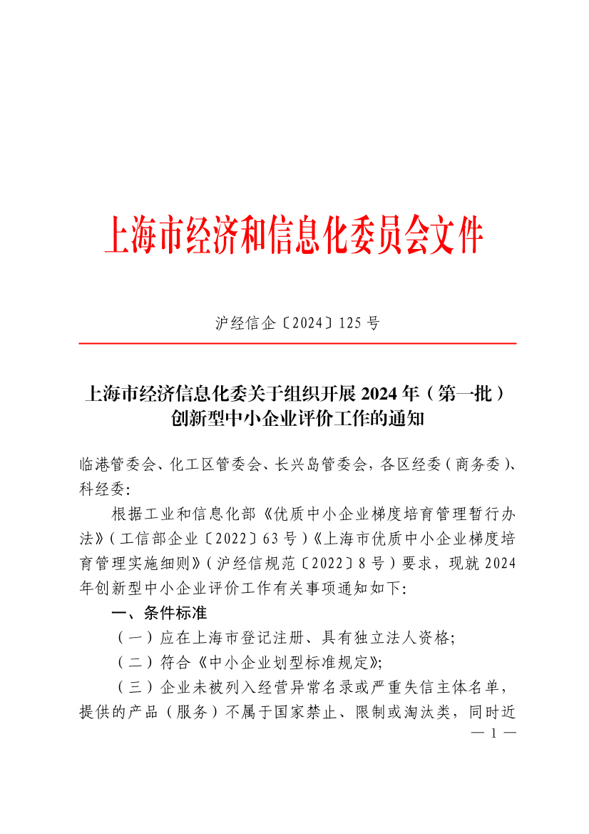 根据工业和信息化部《优质中小企业梯度培育管理暂行办法》(工信部企业〔2022〕63号)《上海市优质中小企业梯度培育管理实施细则》(沪经信规范〔2022〕8号)要求,现就2024年创新型中小企业评价工作有关事项通知如下: