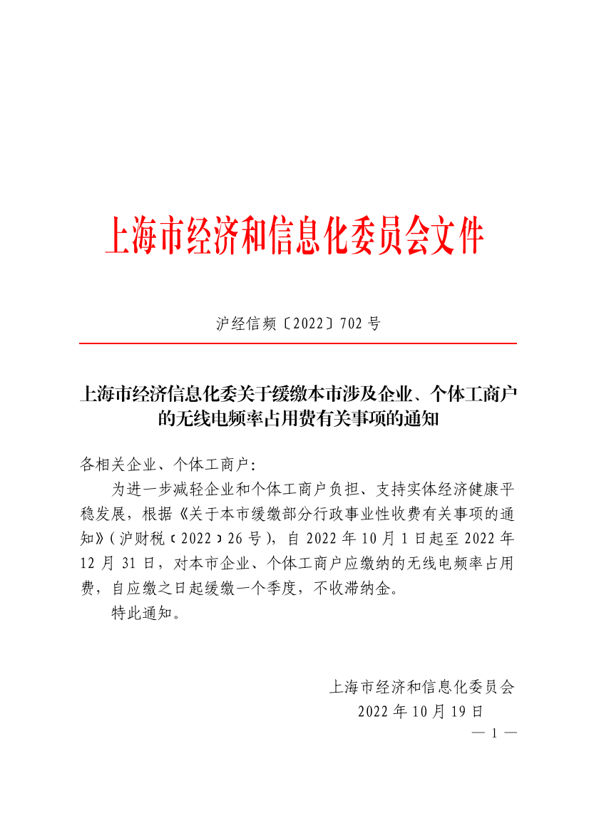 为进一步减轻企业和个体工商户负担、支持实体经济健康平稳发展,根据《关于本市缓缴部分行政事业性收费有关事项的通知》(沪财税﹝2022﹞26号),自2022年10月1日起至2022年12月31日,对本市企业、个体工商户应缴纳的无线电频率占用费,自应缴之日起缓缴一个季度,不收滞纳金。