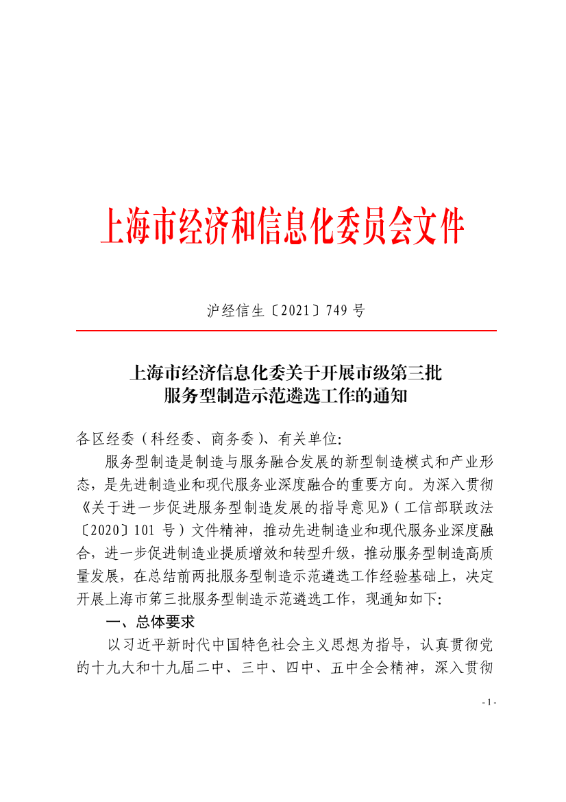 服务型制造是制造与服务融合发展的新型制造模式和产业形态,是先进制造业和现代服务业深度融合的重要方向。为深入贯彻《关于进一步促进服务型制造发展的指导意见》(工信部联政法〔2020〕101号)文件精神,推动先进制造业和现代服务业深度融合,进一步促进制造业提质增效和转型升级,推动服务型制造高质量发展,在总结前两批服务型制造示范遴选工作经验基础上,决定开展上海市第三批服务型制造示范遴选工作,现通知如下: