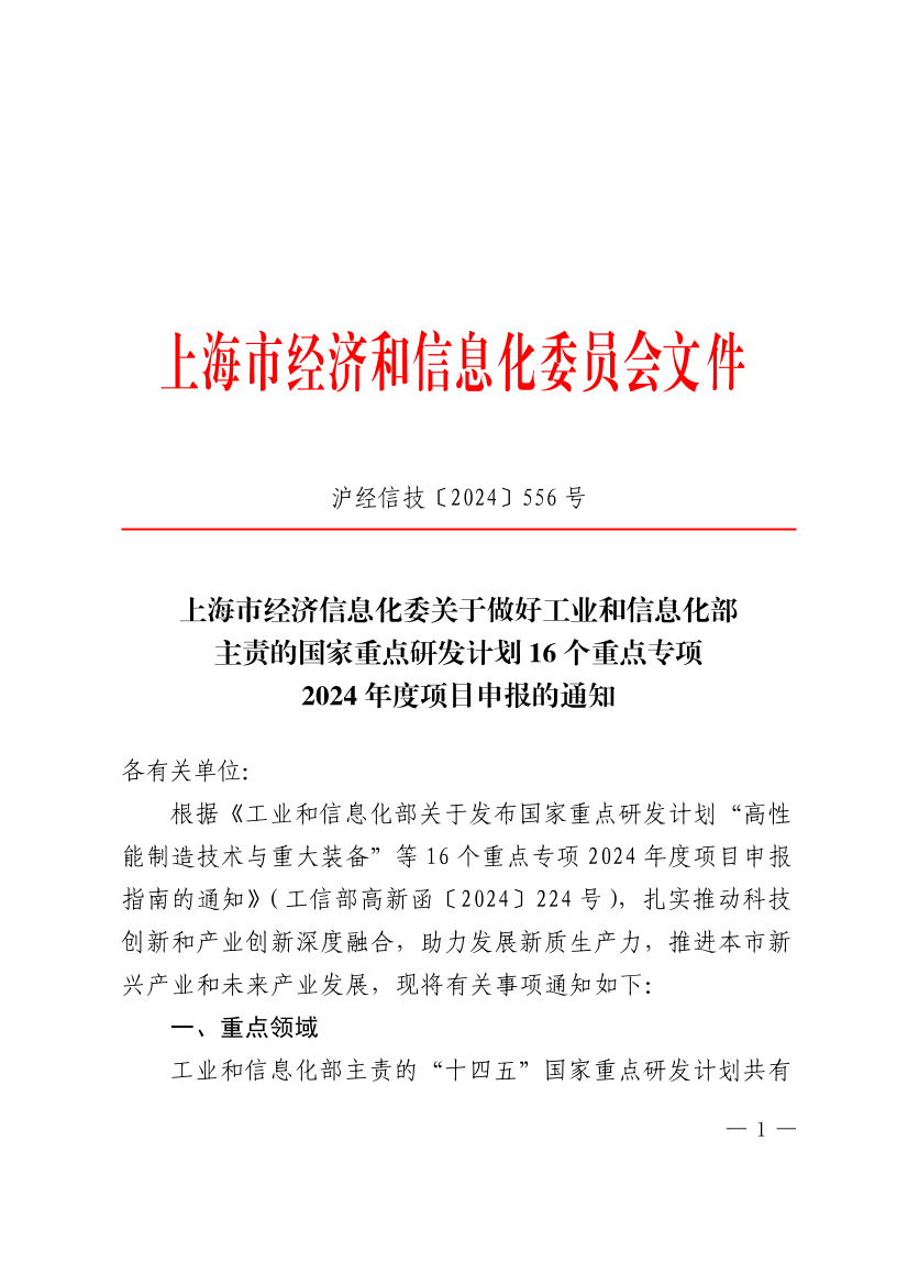根据《工业和信息化部关于发布国家重点研发计划“高性能制造技术与重大装备”等16个重点专项2024年度项目申报指南的通知》(工信部高新函〔2024〕224号),扎实推动科技创新和产业创新深度融合,助力发展新质生产力,推进本市新兴产业和未来产业发展,现将有关事项通知如下: