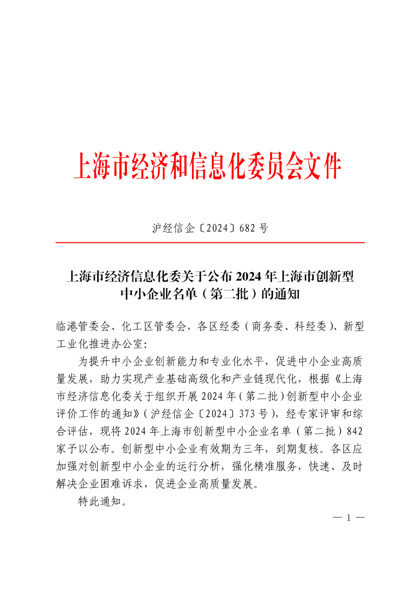 关于公布2024年上海市创新型中小企业名单(第二批)的通知