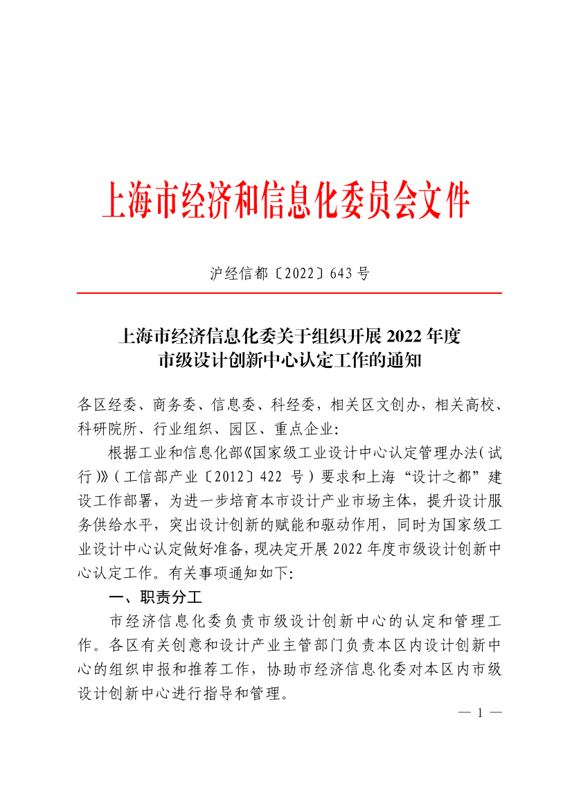 根据工业和信息化部《国家级工业设计中心认定管理办法(试行)》(工信部产业〔2012〕422号)要求和上海“设计之都”建设工作部署,为进一步培育本市设计产业市场主体,提升设计服务供给水平,突出设计创新的赋能和驱动作用,同时为国家级工业设计中心认定做好准备,现决定开展2022年度市级设计创新中心认定工作。有关事项通知如下: