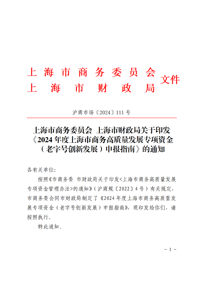 按照《市商务委 市财政局关于印发<上海市商务高质量发展专项资金管理办法>的通知》(沪商规〔2022〕4号)有关规定,市商务委会同市财政局制定了《2024年度上海市商务高质量发展专项资金(老字号创新发展)申报指南》,现印发给你们,请按照执行。