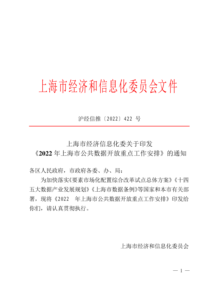 为加快落实《要素市场化配置综合改革试点总体方案》《十四五大数据产业发展规划》《上海市数据条例》等国家和本市有关部署,现将《2022年上海市公共数据开放重点工作安排》印发给你们,请认真贯彻执行。