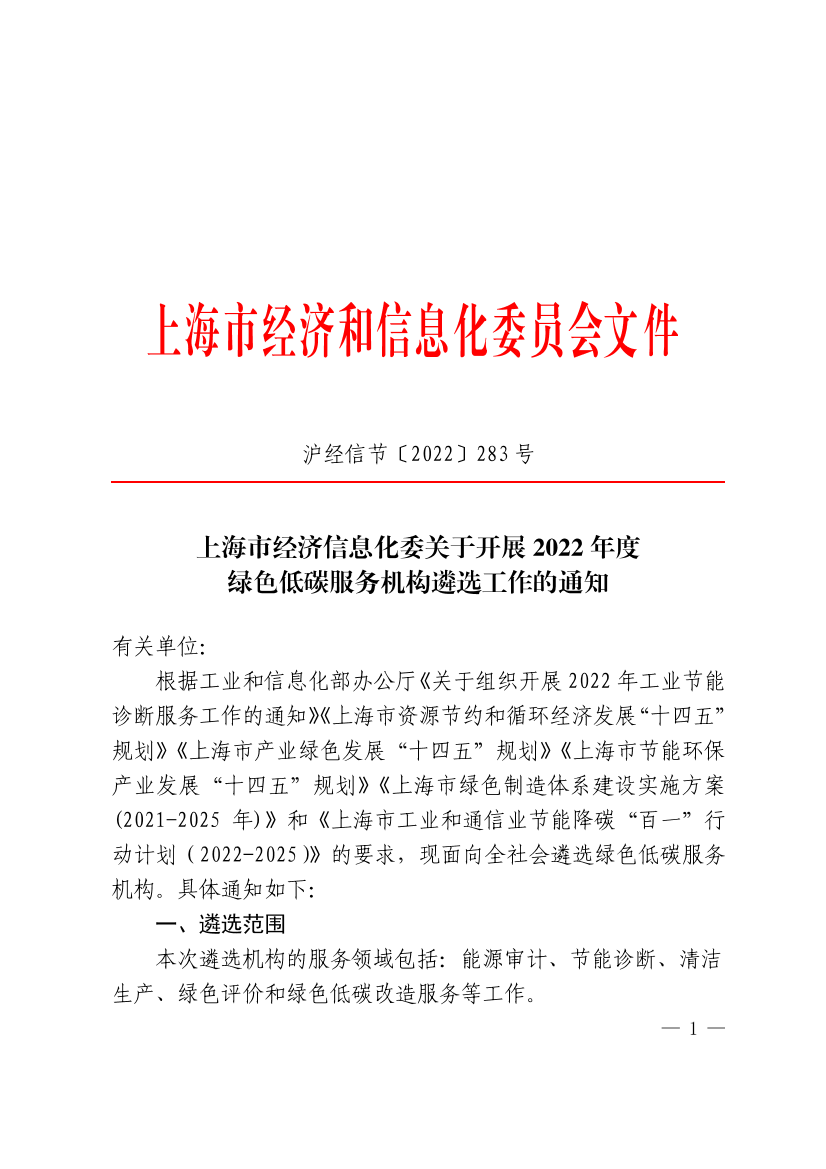根据工业和信息化部办公厅《关于组织开展2022年工业节能诊断服务工作的通知》《上海市资源节约和循环经济发展“十四五”规划》《上海市产业绿色发展“十四五”规划》《上海市节能环保产业发展“十四五”规划》《上海市绿色制造体系建设实施方案(2021-2025年)》和《上海市工业和通信业节能降碳“百一”行动计划(2022-2025)》的要求,现面向全社会遴选绿色低碳服务机构。具体通知如下: