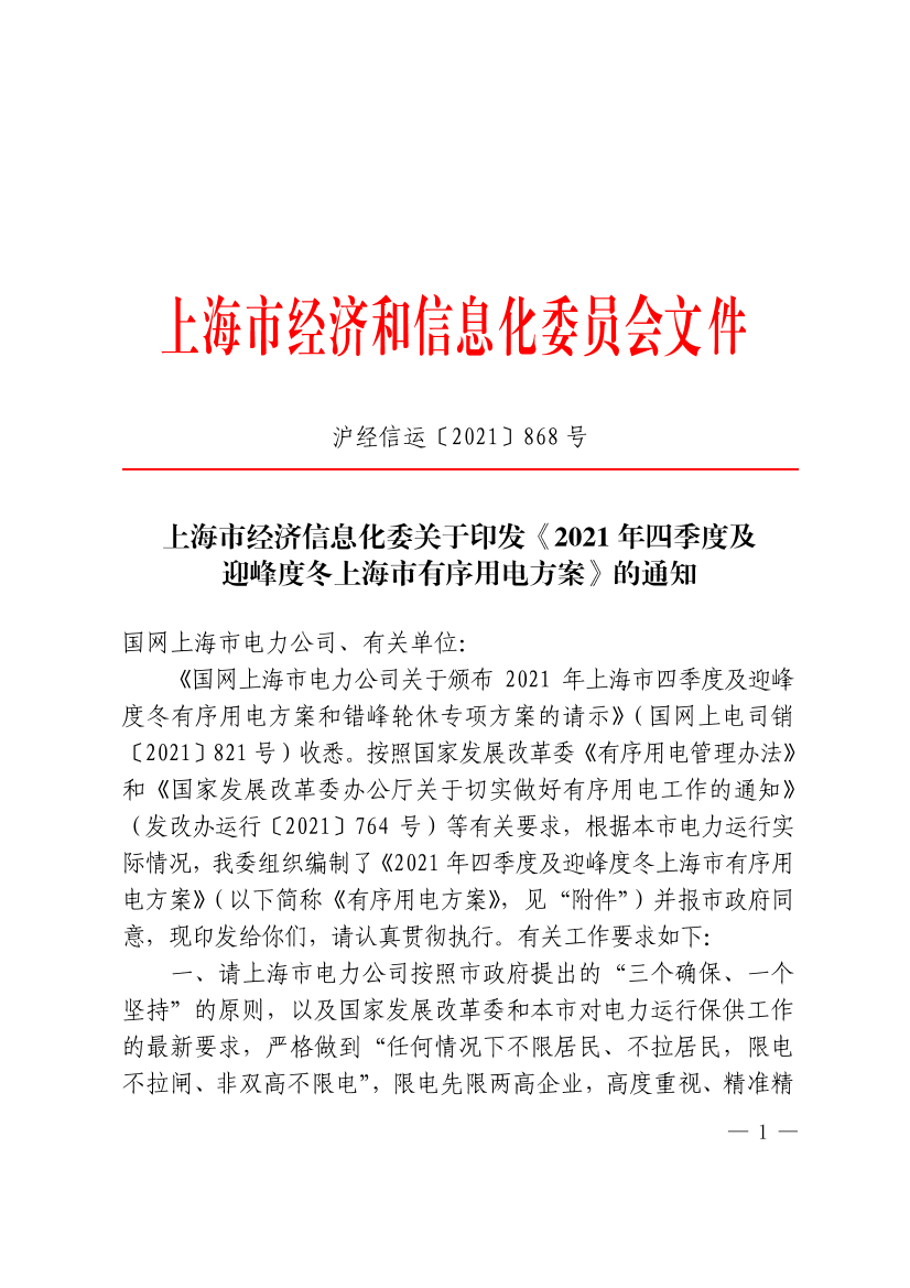 《国网上海市电力公司关于颁布2021年上海市四季度及迎峰度冬有序用电方案和错峰轮休专项方案的请示》(国网上电司销〔2021〕821号)收悉。按照国家发展改革委《有序用电管理办法》和《国家发展改革委办公厅关于切实做好有序用电工作的通知》(发改办运行〔2021〕764号)等有关要求,根据本市电力运行实际情况,我委组织编制了《2021年四季度及迎峰度冬上海市有序用电方案》(以下简称《有序用电方案》,见“附件”)并报市政府同意,现印发给你们,请认真贯彻执行。有关工作要求如下:
