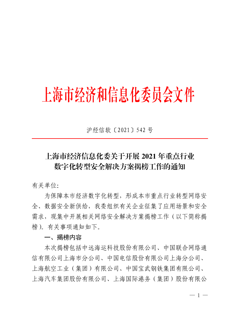 为保障本市经济数字化转型,形成本市重点行业转型网络安全、数据安全新供给,我委组织有关企业征集了应用场景和安全需求,现集中开展相关网络安全解决方案揭榜工作(以下简称揭榜)。有关事项通知如下。