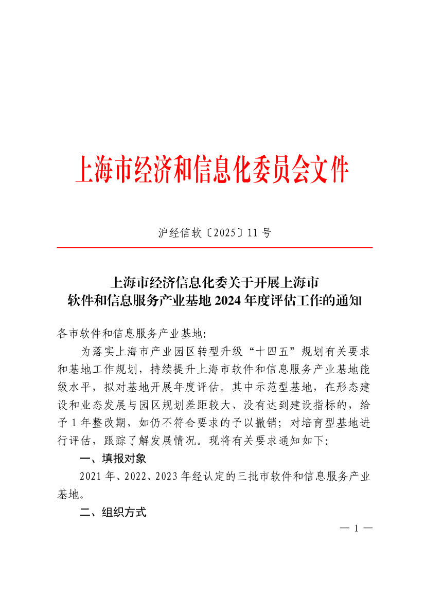 为落实上海市产业园区转型升级“十四五”规划有关要求和基地工作规划,持续提升上海市软件和信息服务产业基地能级水平,拟对基地开展年度评估。其中示范型基地,在形态建设和业态发展与园区规划差距较大、没有达到建设指标的,给予1年整改期,如仍不符合要求的予以撤销;对培育型基地进行评估,跟踪了解发展情况。现将有关要求通知如下: