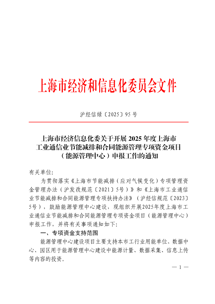 为贯彻落实《上海市节能减排(应对气候变化)专项管理资金管理办法(沪发改规范〔2021〕5号)》和《上海市工业通信业节能减排和合同能源管理专项扶持办法》(沪经信规范〔2023〕5号),鼓励能源管理中心建设,现组织开展2025年度上海市工业通信业节能减排和合同能源管理专项资金项目(能源管理中心)申报工作,并将有关事项通知如下: