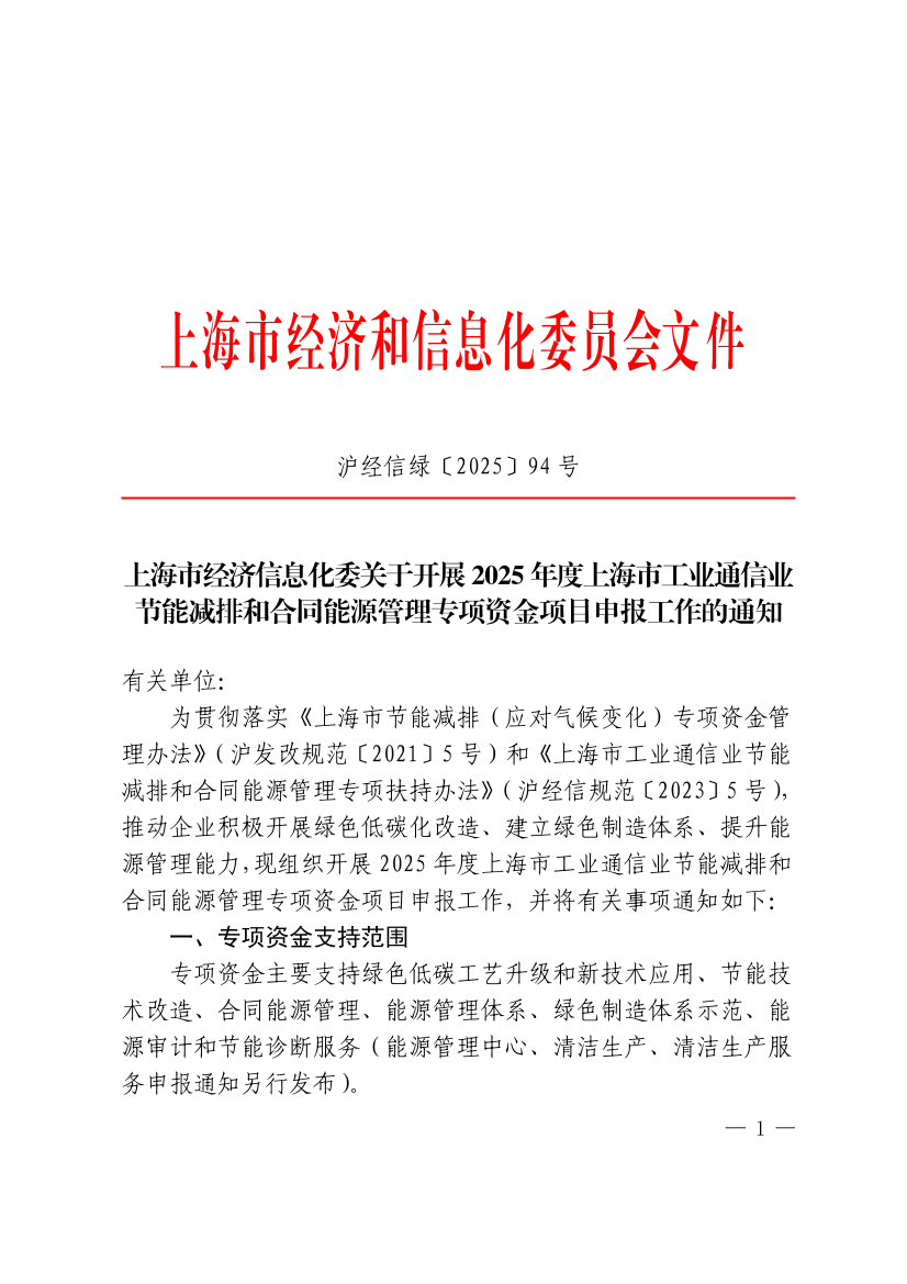为贯彻落实《上海市节能减排(应对气候变化)专项资金管理办法》(沪发改规范〔2021〕5号)和《上海市工业通信业节能减排和合同能源管理专项扶持办法》(沪经信规范〔2023〕5号),推动企业积极开展绿色低碳化改造、建立绿色制造体系、提升能源管理能力,现组织开展2025年度上海市工业通信业节能减排和合同能源管理专项资金项目申报工作,并将有关事项通知如下: