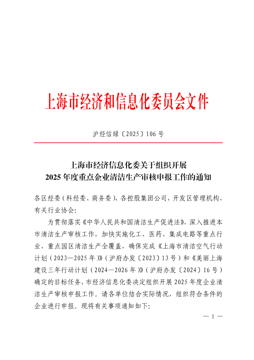 为贯彻落实《中华人民共和国清洁生产促进法》,深入推进本市清洁生产审核工作,加快实施化工、医药、集成电路等重点行业、重点园区清洁生产全覆盖,确保完成《上海市清洁空气行动计划(2023—2025年)》(沪府办发〔2023〕13号)和《美丽上海建设三年行动计划(2024—2026年)》(沪府办发〔2024〕16号)确定的目标任务,市经济信息化委决定组织开展2025年度企业清洁生产审核申报工作。请各单位结合实际情况,组织符合条件的企业进行申报。现将有关事项通知如下: