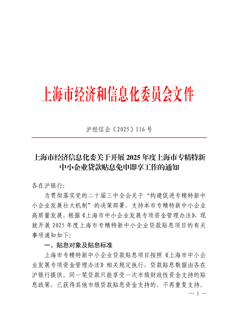 为贯彻落实党的二十届三中全会关于“构建促进专精特新中小企业发展壮大机制”的决策部署,支持本市专精特新中小企业高质量发展,根据《上海市中小企业发展专项资金管理办法》,现就开展2025年度上海市专精特新中小企业贷款贴息项目的有关事项通知如下: