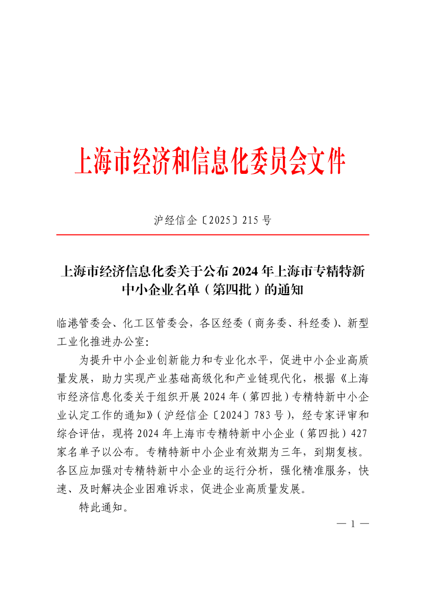 为提升中小企业创新能力和专业化水平,促进中小企业高质量发展,助力实现产业基础高级化和产业链现代化,根据《上海市经济信息化委关于组织开展2024年(第四批)专精特新中小企业认定工作的通知》(沪经信企〔2024〕783号),经专家评审和综合评估,现将2024年上海市专精特新中小企业(第四批)427家名单予以公布。专精特新中小企业有效期为三年,到期复核。各区应加强对专精特新中小企业的运行分析,强化精准服务,快速、及时解决企业困难诉求,促进企业高质量发展。