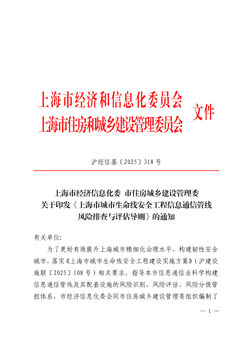 为了更好有效提升上海城市精细化治理水平,构建韧性安全城市,落实《上海市城市生命线安全工程建设实施方案》(沪建设施联〔2025〕108号)相关要求,指导本市信息通信业科学构建信息通信管线及其配套设施的风险识别、风险评估、风险分级管控体系,市经济信息化委会同市住房城乡建设管理委组织编制了《上海市城市生命线安全工程信息通信管线风险排查与评估导则》,现印发给你们,请参照执行。