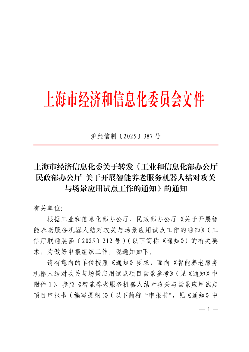 根据工业和信息化部办公厅、民政部办公厅《关于开展智能养老服务机器人结对攻关与场景应用试点工作的通知》(工信厅联通装函〔2025〕212号)(以下简称《通知》)的有关要求,为做好申报组织工作,现通知如下。