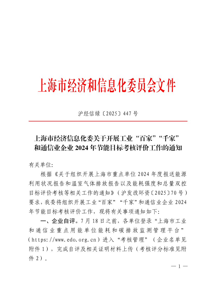 根据《关于组织开展上海市重点单位2024年度报送能源利用状况报告和温室气体排放报告以及能耗强度和总量双控目标评价考核等相关工作的通知》(沪发改环资〔2025〕70号)要求,我委将组织开展工业“百家”“千家”和通信业企业2024年节能目标考核评价工作,现将有关事项通知如下: