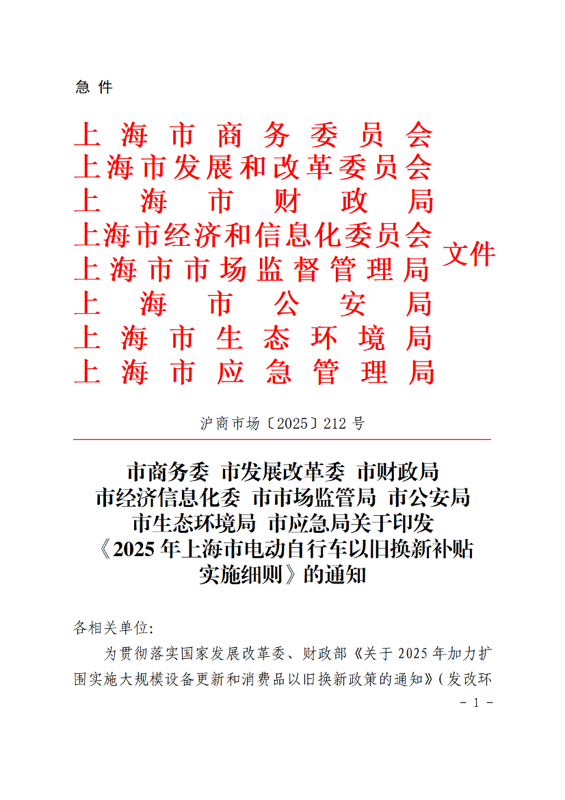为贯彻落实国家发展改革委、财政部《关于2025年加力扩围实施大规模设备更新和消费品以旧换新政策的通知》(发改环资〔2025〕13号)、《商务部等5部门办公厅(室)关于做好2025年度电动自行车以旧换新工作的通知》(商办流通函〔2025〕10号)、《上海市关于2025年加力扩围推进大规模设备更新和消费品以旧换新工作的实施方案》(沪发改环资〔2025〕21号)等工作要求,现印发《2025年上海市电动自行车以旧换新补贴实施细则》,请认真贯彻执行。