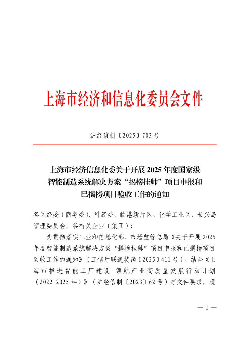 为贯彻落实工业和信息化部、市场监管总局《关于开展2025年度智能制造系统解决方案“揭榜挂帅”项目申报和已揭榜项目验收工作的通知》(工信厅联通装函〔2025〕411号),结合《上海市推进智能工厂建设 领航产业高质量发展行动计划(2022-2025年)》(沪经信制〔2023〕62号)等文件要求,现启动2025年度国家级智能制造系统解决方案“揭榜挂帅”项目申报和已揭榜项目验收工作,具体通知如下: