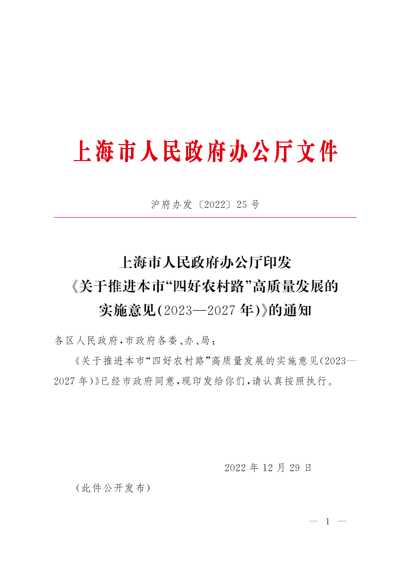 上海市人民政府办公厅印发《关于推进本市“四好农村路”高质量发展的实施意见(2023—2027年)》的通知