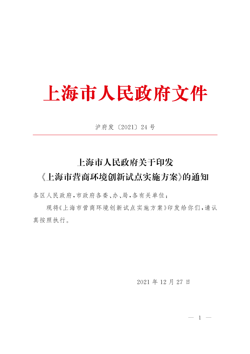 上海市人民政府关于印发《上海市营商环境创新试点实施方案》的通知