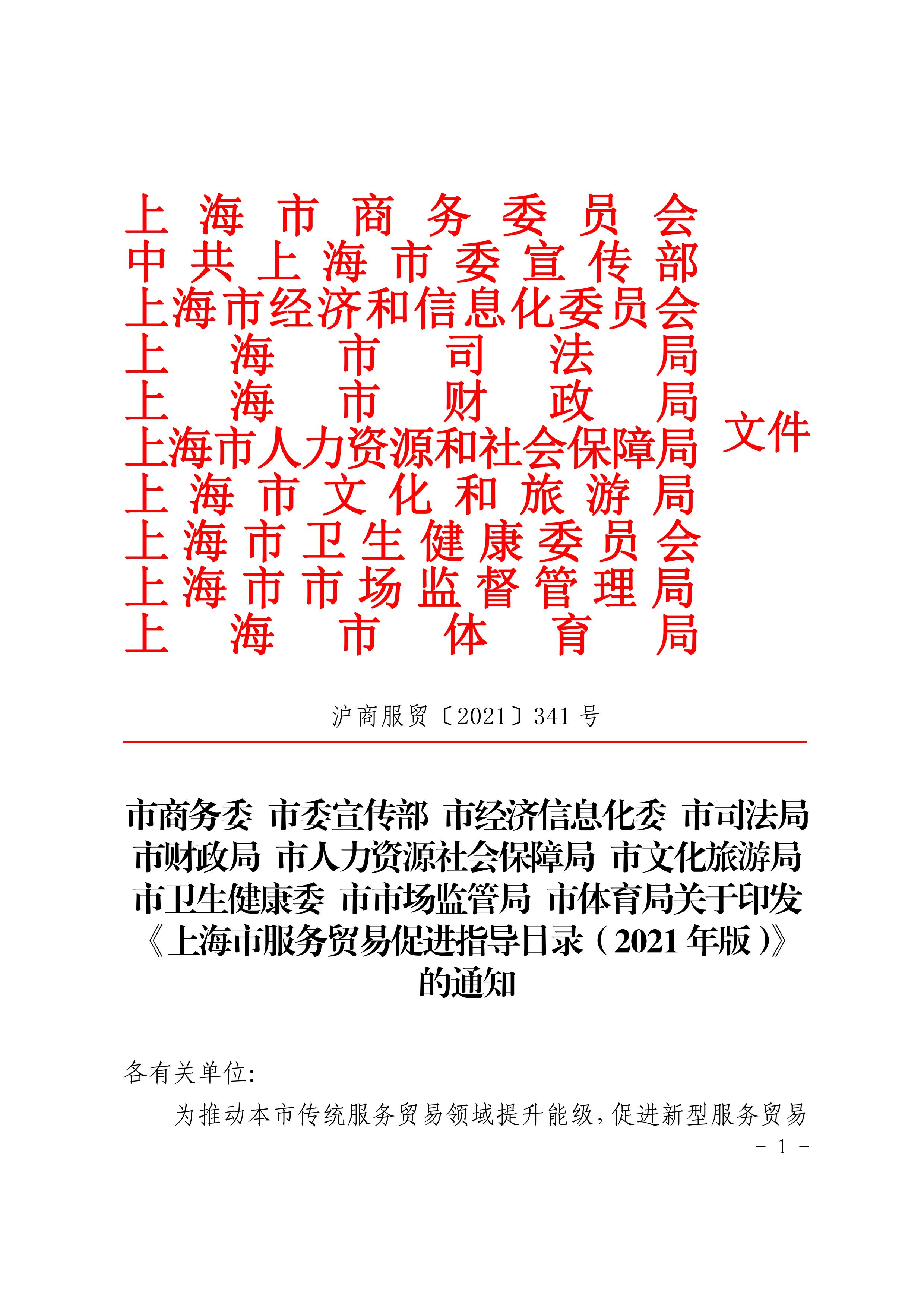 为推动本市传统服务贸易领域提升能级,促进新型服务贸易业态快速增长,现将《上海市服务贸易促进指导目录(2021年版)》印发给你们,请遵照执行。