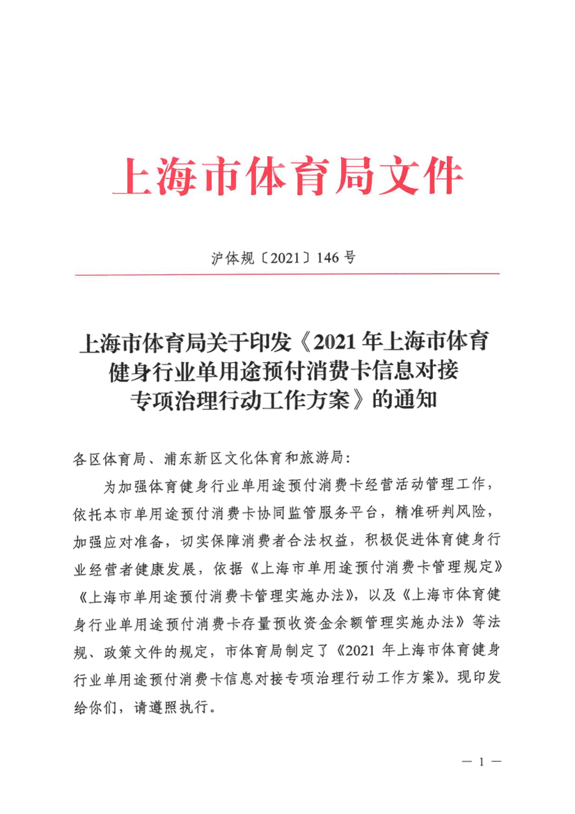 为加强体育健身行业单用途预付消费卡经营活动管理工作,依托本市单用途预付消费卡协同监管服务平台,精准研判风险,加强应对准备,切实保障消费者合法权益,积极促进体育健身行业经营者健康发展,依据《上海市单用途预付消费卡管理规定》《上海市单用途预付消费卡管理实施办法》,以及《上海市体育健身行业单用途预付消费卡存量预收资金余额管理实施办法》等法规、政策文件的规定,市体育局制定了《2021年上海市体育健身行业单用途预付消费卡信息对接专项治理行动工作方案》。现印发给你们,请遵照执行。