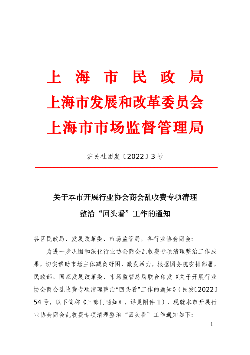 为进一步巩固和深化行业协会商会乱收费专项清理整治工作成果,切实帮助市场主体减负纾困、激发活力,根据国务院安排部署,民政部、国家发展改革委、市场监管总局联合印发《关于开展行业协会商会乱收费专项清理整治“回头看”工作的通知》(民发〔2022〕54号,以下简称《三部门通知》,详见附件1),现就本市开展行业协会商会乱收费专项清理整治“回头看”工作通知如下:
