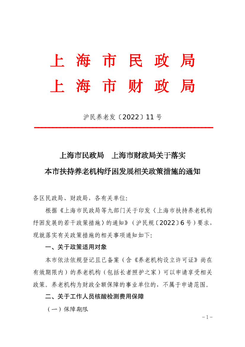 根据《上海市民政局等九部门关于印发〈上海市扶持养老机构纾困发展的若干政策措施〉的通知》(沪民规〔2022〕6号)要求,现就落实有关政策措施的相关事项通知如下: