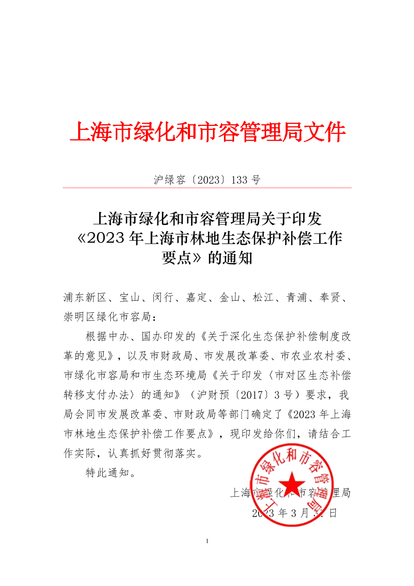 根据中办、国办印发的《关于深化生态保护补偿制度改革的意见》,以及市财政局、市发展改革委、市农业农村委、市绿化市容局和市生态环境局《关于印发〈市对区生态补偿转移支付办法〉的通知》(沪财预〔2017〕3号)要求,我局会同市发展改革委、市财政局等部门确定了《2023年上海市林地生态保护补偿工作要点》,现印发给你们,请结合工作实际,认真抓好贯彻落实。