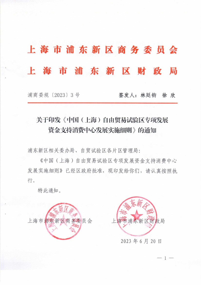 《中国(上海)自由贸易试验区专项发展资金支持消费中心发展实施细则》已经区政府批准,现印发给你们,请认真按照执行。