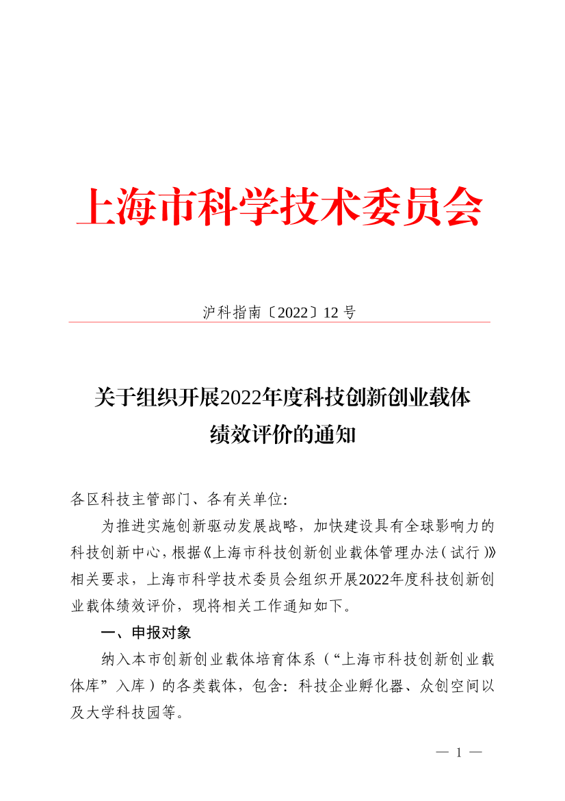 为推进实施创新驱动发展战略,加快建设具有全球影响力的科技创新中心,根据《上海市科技创新创业载体管理办法(试行)》相关要求,上海市科学技术委员会组织开展2022年度科技创新创业载体绩效评价,现将相关工作通知如下。