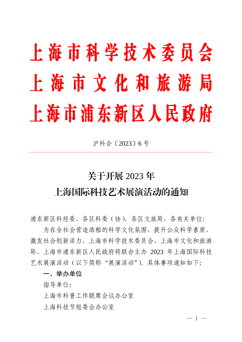 为在全社会营造浓郁的科学文化氛围,提升公众科学素质,激发社会创新活力,上海市科学技术委员会、上海市文化和旅游局、上海市浦东新区人民政府将联合主办2023年上海国际科技艺术展演活动(以下简称“展演活动”)。具体事项通知如下: