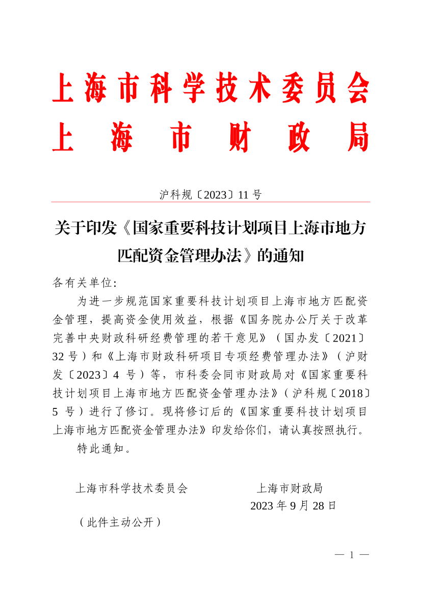 为进一步规范国家重要科技计划项目上海市地方匹配资金管理,提高资金使用效益,根据《国务院办公厅关于改革完善中央财政科研经费管理的若干意见》(国办发〔2021〕32号)和《上海市财政科研项目专项经费管理办法》(沪财发〔2023〕4号)等,市科委会同市财政局对《国家重要科技计划项目上海市地方匹配资金管理办法》(沪科规〔2018〕5号)进行了修订。现将修订后的《国家重要科技计划项目上海市地方匹配资金管理办法》印发给你们,请认真按照执行。