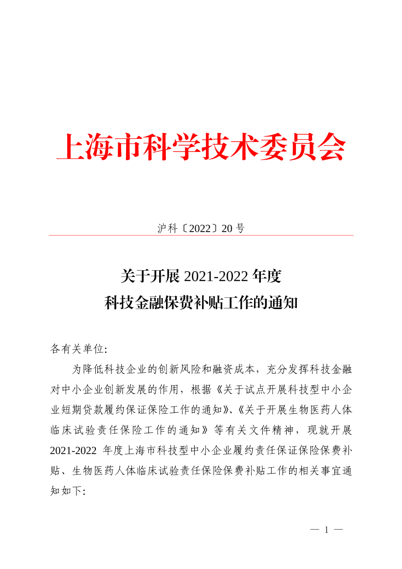 为降低科技企业的创新风险和融资成本,充分发挥科技金融对中小企业创新发展的作用,根据《关于试点开展科技型中小企业短期贷款履约保证保险工作的通知》、《关于开展生物医药人体临床试验责任保险工作的通知》等有关文件精神,现就开展2021-2022年度上海市科技型中小企业履约责任保证保险保费补贴、生物医药人体临床试验责任保险保费补贴工作的相关事宜通知如下: