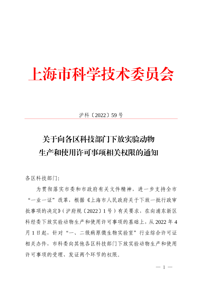 为贯彻落实市委和市政府有关文件精神,进一步支持全市“一业一证”改革,根据《上海市人民政府关于下放一批行政审批事项的决定》(沪府规〔2022〕1号)有关要求,在向浦东新区科经委下放实验动物生产和使用许可事项的基础上,从2022年4月1日起,针对“一、二级病原微生物实验室”行业综合许可证相关办件,市科委向其他各区科技部门下放实验动物生产和使用许可事项的受理、发证两个环节的权限。