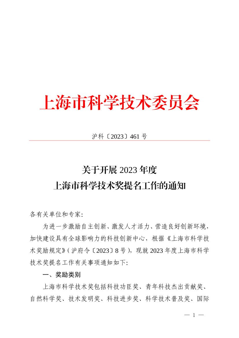 关于开展2023年度上海市科学技术奖提名工作的通知