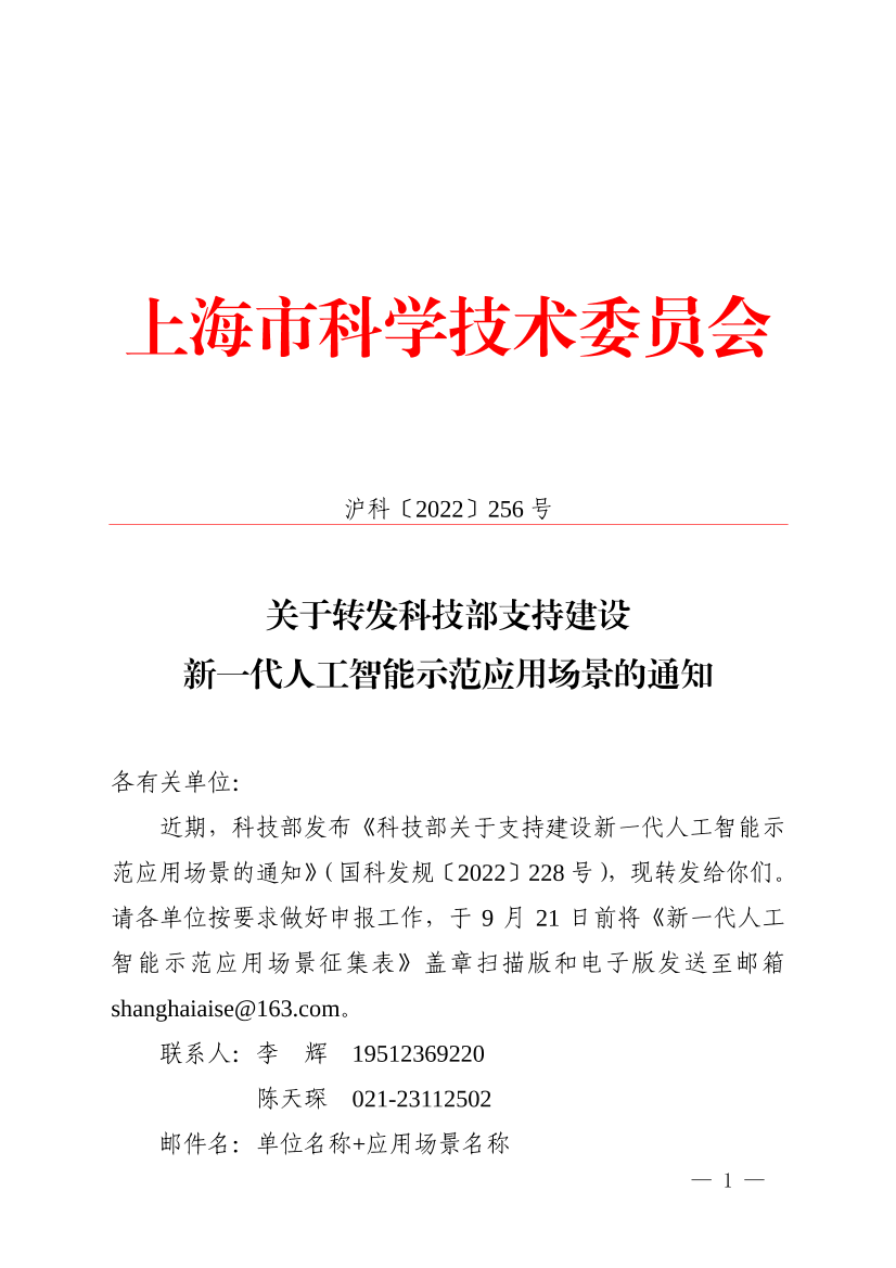 近期,科技部发布《科技部关于支持建设新一代人工智能示范应用场景的通知》(国科发规〔2022〕228号),现转发给你们。请各单位按要求做好申报工作,于9月21日前将《新一代人工智能示范应用场景征集表》盖章扫描版和电子版发送至邮箱shanghaiaise@163.com。
